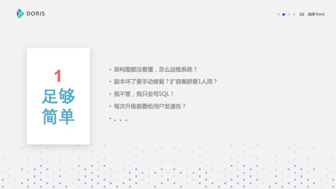 一款数据库产品的引入,本质上是提升企业在数据分析和决策方面的效率。而如果数据库系统本身在使用和运维方面有着极高的成本,那么即使这款数据库的性能再优异,依然无法给企业带来整体上的效能提升。所以 Doris 在系统易用性和维护性方面做了大量的工作,来帮助用户降低和数据库本身系统相关的使用和运维成本,从而帮助用户专注于业务逻辑的开发。