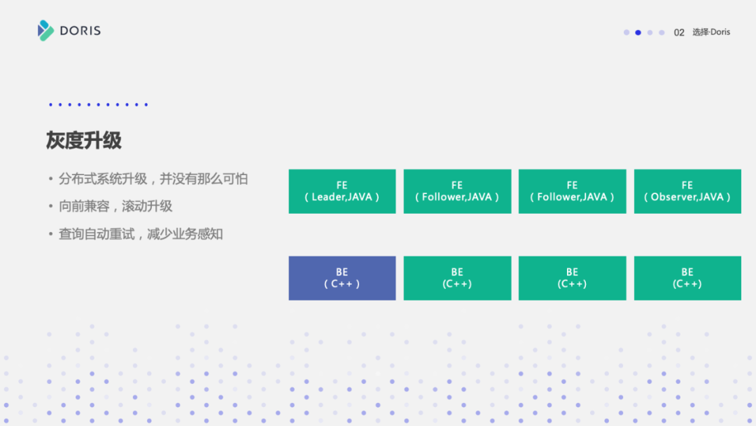 作为一款分布式系统,Doris 的升级方式却极其简单,只需要替换二进制程序,滚动重启集群即可。在设计上,Doris 完全向前兼容,所以也可以通过灰度升级的方式进行新版本的验证和测试。而 Doris 本身的一些失败重试和故障路由,也极大程度的降低了在升级过程中对业务的影响。