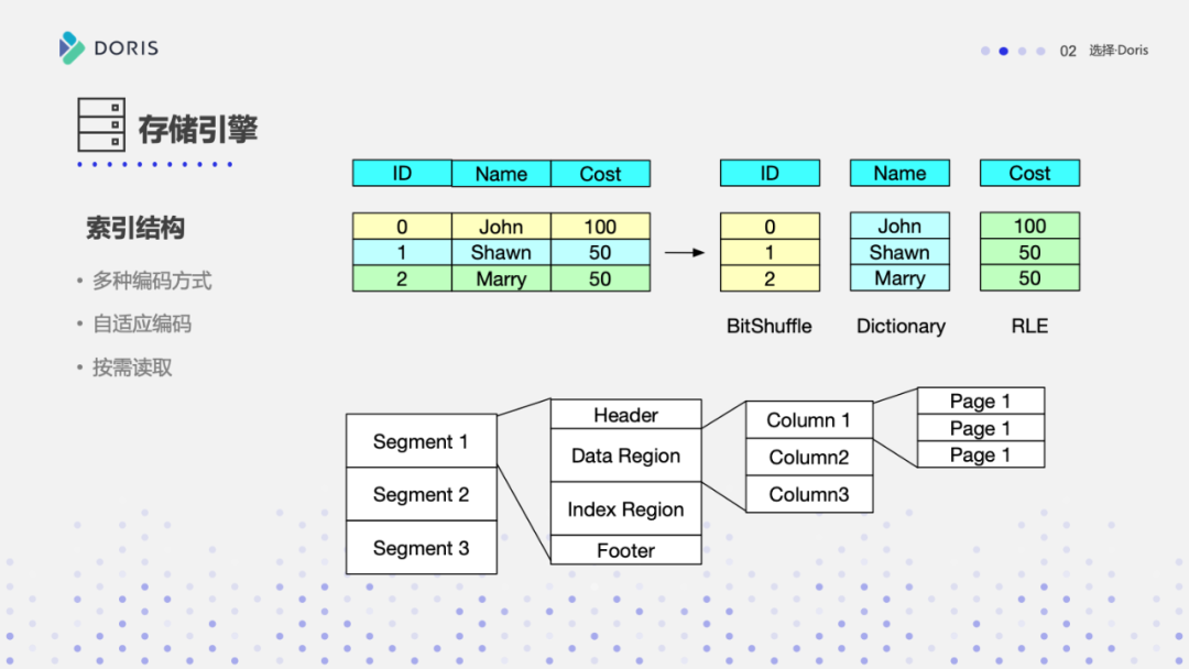 和大多数分析型数据库一样,Doris 也是以列存格式存储数据的。数据按照列进行连续存储,因为类型相同,因此可以获得极高的压缩率,节省磁盘空间。Doris 对不同的列类型还提供了不同的编码方式,如 INT 类型会使用 BitShuffle 的编码方式,而字符串类型会使用字典编码。更进一步的,Doris 还会自动根据列的值来切换编码类型。比如对于字符串类型,如果列值的 distinct 值较多,则不再使用字典编码,而直接切换到 Plain Text 编码,以节省不必要的空间浪费。