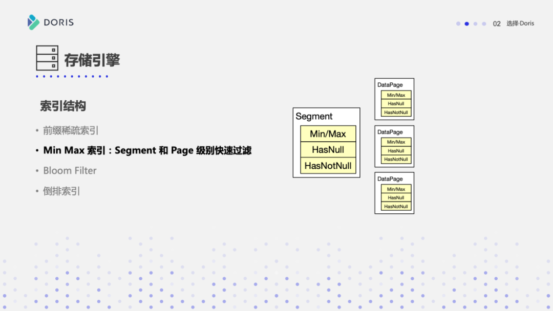 MinMax索引是建立在 Segment 和 Page 级别的索引。对于 Page 中的每一列,都会记录在这个 Page 中的最大值和最小值,同样,在 Segment 级别也会对每一列的最大值和最小值进行记录。这样当进行等值或范围查询时,可以通过MinMax索引快速过滤掉不需要读取的行。