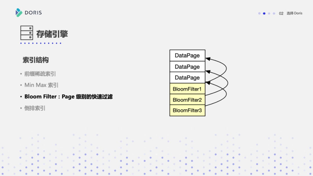 针对不同的数据,Doris 也实现了不通过的 Filter 类型,如 In Predicate,Bloom Filter 和 Min Max。用户可以根据不同场景进行选择。