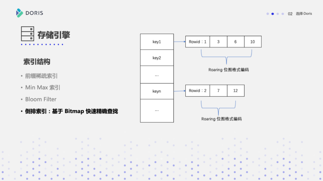 倒排索引也是一种需要用户自主选择是否创建的索引。该索引也是基于位图的一种索引结构,其索引Key是实际的列值,而 Value 是该值在数据文件中的offset。通过倒排索引,可以很快定位到列值对应的行号,进行快速取数。这种索引比较合适在基数较低的列上进行等值查询的场景,比如城市等。