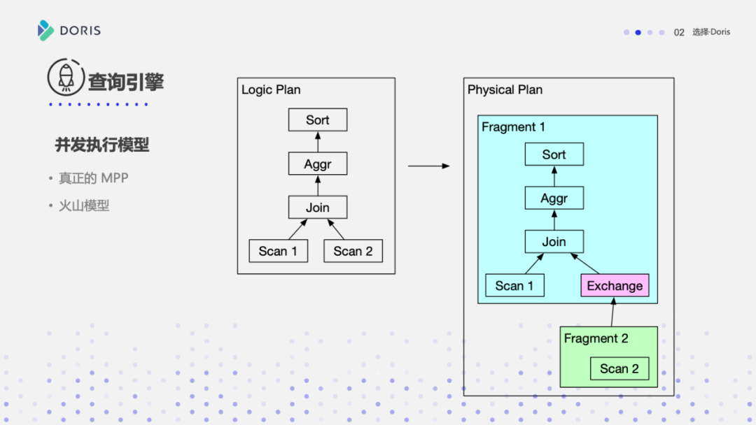 Doris 的查询引擎是基于 MPP 的火山模型,是从早期版本的 Apache Impala 演化而来。一个真正的 MPP 执行框架,相对于一些分布式 Gette-Setter 框架,最显著的区别在于其实现了 Exchange 节点。在 Doris 中,一个SQL语句会先生成一个逻辑执行计划,然后根据数据的分布,形成一个物理执行计划。物理执行计划会有多个 Fragment,而 Fragment 直接的数据传输则是由 Exchange 节点完成的。有了 Exchange 节点,最大的收益是整个查询框架拥有了数据 Reshuffle 的能力,通过这个能力,查询的计算节点不在局限于数据的存储节点,从而能够更好的利用多节点资源进行并行数据处理。