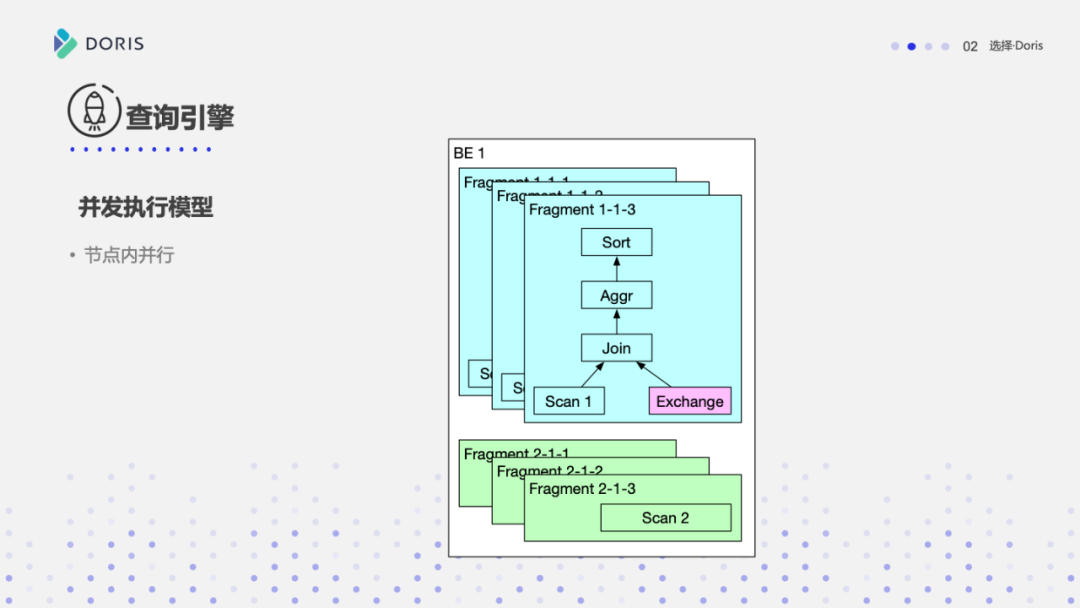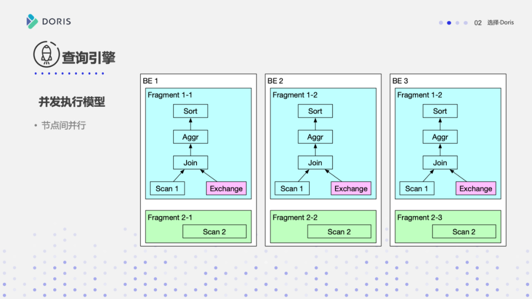 如上图,物理执行计划中的 Fragment 会被发往多个 BE 节点并行执行。不同 Fragment 之间的数据通过 Exchange 节点,根据规则 Shuffle 到对应的上层 Fragment 中。