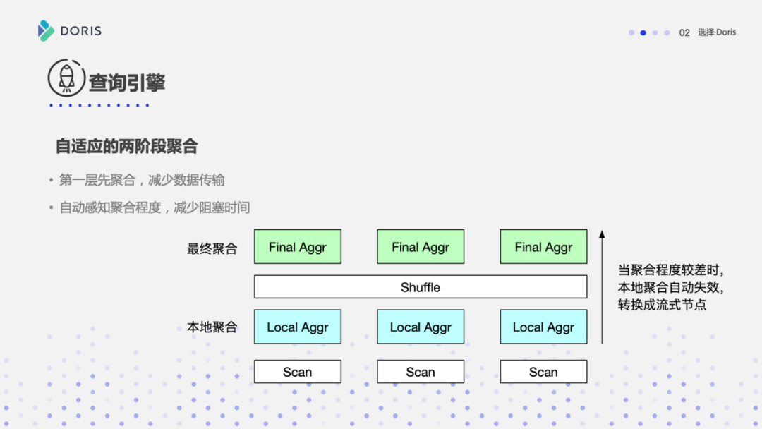 在此基础上,Doris 还实现了自适应的聚合算法。首先我们要知道,聚合算子是一种阻塞型的算子,他需要等到全部数据处理完成后,才会将数据发送给上层节点。而自适应聚合算法的意思是,在第一级聚合算子中,如果发现数据的聚合效果很低,即使聚合后也无法有效降低需要传输的数据量时,则会自动的停止第一级聚合,而将算子转换为一个非阻塞的流式算子,直接将读取到的数据发送到上层节点,从而避免了不必要的阻塞等待时间。