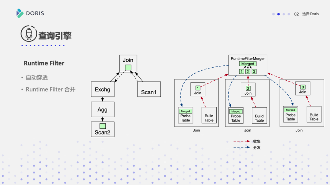 同时,Runtime Filter 可以适用于大部分 Join 场景,包括节点的自动穿透,将 Filter 穿透下推到最底层的扫描节点,或者在分部署 Shuffle Join 中,将多个节点产生的 Filter 进行合并后再下推等。