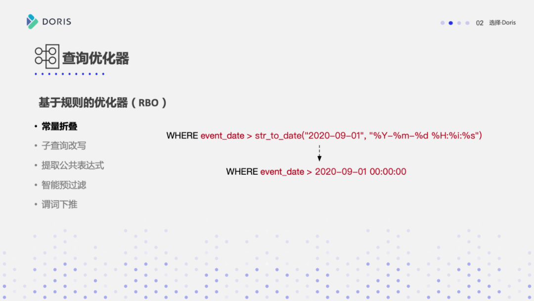 除了查询执行层方面的优化,Doris 在查询优化器方面也做了大量的工作。Doris 查询优化器能够同时进行基于规则和基于代价的查询优化。在基于规则的查询优化方面,Doris 包括但不限于以下优化规则: