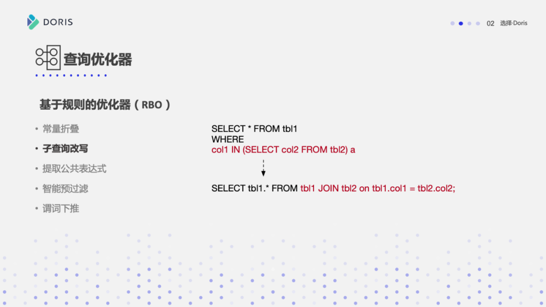 子查询改写会将子查询改写为 Join 操作,从而利用 Doris 在 Join 上做的一系列优化来提升查询效率。