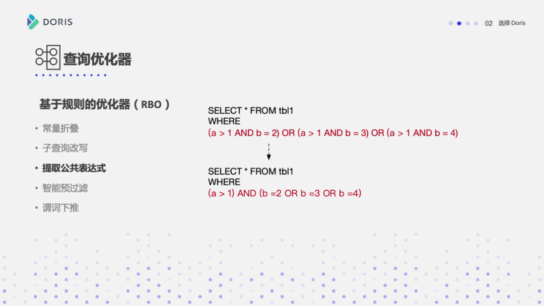 提取公共表达式可以将SQL中的一些析取范式转换成和取范式,而和取范式通常是对查询执行引擎友好的,可以进行条件的拆分来进行不同级别的谓词下推和计算工作。