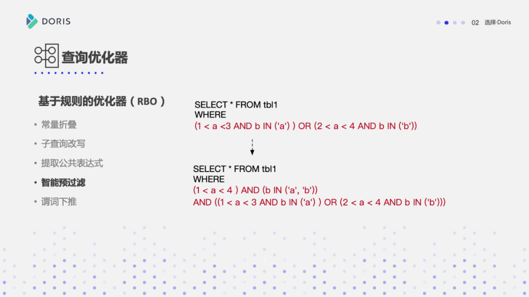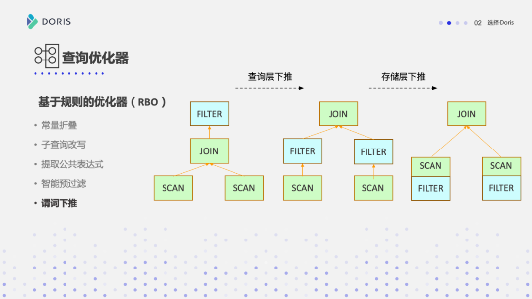 谓词下推也是查询优化器常见的优化手段,Doris 中的谓词下推不仅可以穿透算子,更能进一步的下推到存储引擎,利用数据索引进行数据的过滤。
