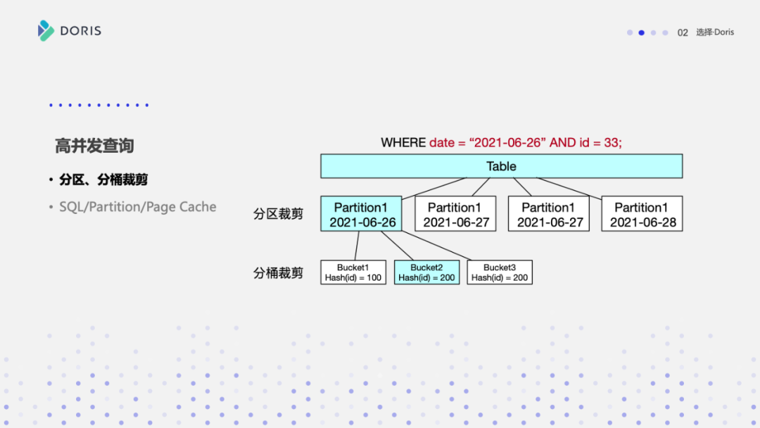 同时,Doris 还支持 SQL 级别和 Partition 级别的 Cache。其中 SQL Cache 以 SQL 语句的 Hash 值作为 Key,直接缓存 SQL 结果,非常适合更新频率不高,但是查询非常频繁的场景。而 Partition 级别的 Cache,会智能的将 SQL 结果中不同分区的结果数据缓存起来,之后的查询,可以利用已缓存分区的数据加上新分区实时查询的数据得到最终的结果,从而降低重复数据的实时查询需求,减少对系统资源的消耗。