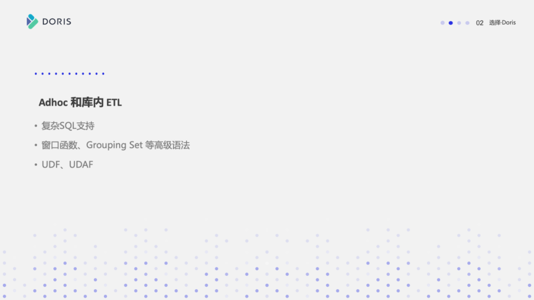 作为一款 MPP 数据库,Adhoc 这类高吞吐的即席查询和库内 ETL 场景也是 Doris 的强项。Doris 能够支持负载 SQL 语法,包括窗口函数、Grouping Set 等高级语法功能,同时还可以通过 UDF 或 UDAF 来自定义拓展 Doris 的功能。在TB级别数据上,Doris 可以部分代替 Hive 等离线系统的功能,使得用户在一套数据库中满足所有需求。