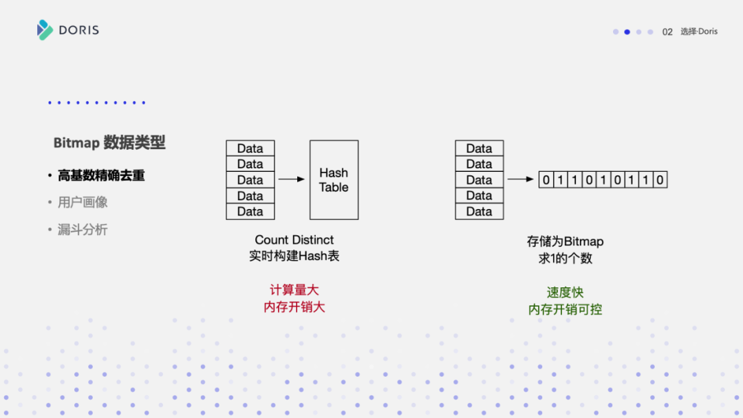 Bitmap 可以应用于高基数精确去重场景。传统的实时计算去重数据的算法,需要在内存中构建 Hash 表来进行数据去重,在基数非常高的情况下,会占用大量的内存。而使用 Bitmap,可以将数值类型转换成位图上的 0 和 1,从而极大的降低内存开销,并且对于去重计算,只需要将多个 bitmap 求交集后计算 1 的个数即可,从而达到在有限的内存开销情况下,进行快速的高基数精确去重计算。