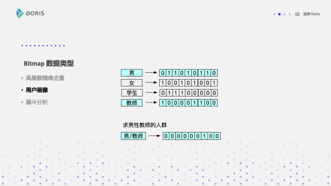 Doris 支持 Bitmap 数据类型。这一数据类型利用位图来存储存储整型数据,并且可以通过位图进行一些集合类操作。