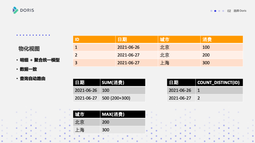 物化视图也是 Doris 的核心特点之一。在 Doris 中,用户可以使用明细数据模型存储明细数据,之后,可以在明细数据上,选择任意维度和指标创建聚合物化视图,如 SUM、MIN、MAX、COUNT 等。Doris 会保证明细表和物化视图中数据的完全一致。同时,物化视图对用户查询是透明的,系统会自动根据查询语句中的模式,匹配到最合适的物化视图进行查询。通过物化视图功能,用户可以在一张表上统一明细和聚合模型,并且加速某些固定模式的查询响应。