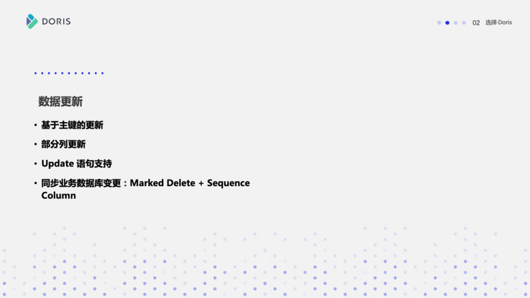 基于 Unique Key 模型,Doris 还通过 Marked Delete 和 Sequence Column 等功能,可以实现对上游 TP 数据库更新数据的同步操作,并且不仅能够保证事务的原子性,还可以保证数据同步的顺序性。