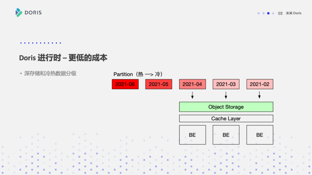 降低成本也是 Doris 的发展方向之一。随着对象存储等廉价高可靠存储设备正在成为大数据体系的标配,一些历史数据或冷数据可以迁移到对象存储上,从而降低对本地磁盘的消耗。并且可以通过缓存策略提供对历史数据的快速查询。