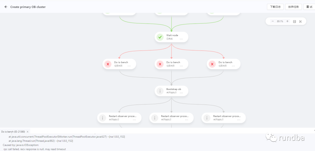 2021-07-04 15:33:06.358 INFO 52 --- [ task-3,c678268d009d4966,4937e6e63375] c.a.o.c.metadb.task.TaskInstanceEntity : task 21361 run with context Context(parallelIdx=0, stringMap={cluster_version=2.2.75, cluster_name=OB_cluster1, startup_option_string=memory_limit=15G,system_memory=15G,cpu_count=32,__min_full_resource_pool_memory=2147483648,cache_wash_threshold=2GB,net_thread_count=8,workers_per_cpu_quota=4,stack_size=512K, service_name=OB_cluster1:2, target_operate_status=NORMAL, ob_connect_address=192.168.80.105, zone3.idc=YT, cluster_type=PRIMARY, ob_cluster_id=2, link_obproxy=false, zone1.idc=WY, primary_zone=zone1, sql_port=2881, service_type=OB_CLUSTER, cluster_id=3, rpm_name=oceanbase-2.2.75-20210108170301.el7.x86_64.rpm, target_cluster_status=RUNNING, zone2.idc=YT}, listMap={root_servers=[5, 6, 7], root_server_ips=[192.168.80.105, 192.168.80.106, 192.168.80.107], zone2.servers=[6], zone3.servers=[7], host_ids=[5, 6, 7], zone1.servers=[5], zone_names=[zone1, zone2, zone3]})2021-07-04 15:33:06.362 INFO 52 --- [ task-3,c678268d009d4966,4937e6e63375] c.a.o.c.metadb.task.TaskInstanceEntity : executor node ip:192.168.80.1042021-07-04 15:33:06.378 INFO 52 --- [ task-3,c678268d009d4966,4937e6e63375] c.a.ocp.core.task.util.OcpAgentUtils : [OcpAgentUtils.runCmd] svrIp=192.168.80.105, port=62888, user=admin, cmd=/home/admin/oceanbase/bin/ob_admin io_bench -c /home/admin/oceanbase/etc -d /data/1/OB_cluster12021-07-04 16:03:01.482 ERROR 52 --- [ task-3,c678268d009d4966,4937e6e63375] c.a.ocp.core.task.util.OcpAgentUtils : got IO exception while do rpc call, message=rpc call failed, recv response is null, may read timeout2021-07-04 16:03:01.498 ERROR 52 --- [ task-3,c678268d009d4966,4937e6e63375] c.a.o.core.task.manager.TaskManagerImpl : got exception while execute task:com.alipay.ocp.core.exception.UnexpectedException: [OCP UnexpectedException]: status=500 INTERNAL_SERVER_ERROR, errorCode=COMMON_RPC_IO_FAILED, args=192.168.80.105,62888at com.alipay.ocp.core.task.util.OcpAgentUtils.callPosMethod(OcpAgentUtils.java:131) ~[ocp-core-2.5.0-20210105.jar!/:2.5.0-20210105]at com.alipay.ocp.core.task.util.OcpAgentUtils.runCmd(OcpAgentUtils.java:50) ~[ocp-core-2.5.0-20210105.jar!/:2.5.0-20210105]at com.alipay.ocp.service.compute.host.HostManager.executeRpcCommand(HostManager.java:82) ~[ocp-service-2.5.0-20210105.jar!/:2.5.0-20210105]at com.alipay.ocp.service.task.business.cluster.IoBenchTask.run(IoBenchTask.java:44) ~[ocp-service-2.5.0-20210105.jar!/:2.5.0-20210105]at com.alipay.ocp.core.metadb.task.TaskInstanceEntity.run(TaskInstanceEntity.java:192) ~[ocp-core-2.5.0-20210105.jar!/:2.5.0-20210105]at com.alipay.ocp.core.task.manager.TaskManagerImpl.lambda$null$1(TaskManagerImpl.java:177) ~[ocp-core-2.5.0-20210105.jar!/:2.5.0-20210105]at com.alipay.ocp.core.task.manager.TaskManagerImpl.redirectOutputIfNotSysSchedule(TaskManagerImpl.java:221) ~[ocp-core-2.5.0-20210105.jar!/:2.5.0-20210105]at com.alipay.ocp.core.task.manager.TaskManagerImpl.lambda$executeTask$2(TaskManagerImpl.java:149) ~[ocp-core-2.5.0-20210105.jar!/:2.5.0-20210105]at java.util.concurrent.Executors$RunnableAdapter.call(Executors.java:511) ~[na:1.8.0_152]at java.util.concurrent.FutureTask.run(FutureTask.java:266) ~[na:1.8.0_152]at com.alipay.ocp.core.thread.TraceDecorator.lambda$decorate$0(TraceDecorator.java:28) ~[ocp-core-2.5.0-20210105.jar!/:2.5.0-20210105]at java.util.concurrent.ThreadPoolExecutor.runWorker(ThreadPoolExecutor.java:1152) ~[na:1.8.0_152]at java.util.concurrent.ThreadPoolExecutor$Worker.run(ThreadPoolExecutor.java:627) ~[na:1.8.0_152]at java.lang.Thread.run(Thread.java:882) ~[na:1.8.0_152]Caused by: java.io.IOException:rpc call failed, recv response is null, may read timeoutat com.alipay.ocp.common.rpc.ZeroRpcClient.receiveResponse(ZeroRpcClient.java:135) ~[ocp-common-2.5.0-20210105.jar!/:2.5.0-20210105]at com.alipay.ocp.common.rpc.ZeroRpcClient.invoke(ZeroRpcClient.java:148) ~[ocp-common-2.5.0-20210105.jar!/:2.5.0-20210105]at com.alipay.ocp.core.task.util.OcpAgentUtils.executePosMethod(OcpAgentUtils.java:250) ~[ocp-core-2.5.0-20210105.jar!/:2.5.0-20210105]at com.alipay.ocp.core.task.util.OcpAgentUtils.callPosMethod(OcpAgentUtils.java:128) ~[ocp-core-2.5.0-20210105.jar!/:2.5.0-20210105]... 13 common frames omitted2021-07-04 16:03:01.506 INFO 52 --- [ task-3,c678268d009d4966,4937e6e63375] c.a.o.c.metadb.task.TaskInstanceEntity : set state failed for task: 21361