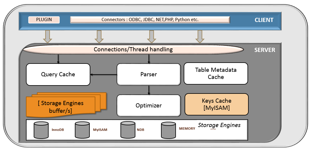 MySQL 是一个典型的 C/S 架构应用程序,MySQL Server 提供数据库服务,完成客户端的请求和操作,Client 则负责连接到 Server。很多初学者并不太容易区分出 MySQL Server 和 Client,因为当我们安装完 MySQL 之后,默认情况下 Server 和 Client 就都具备了,我们在命令行连接并登录 MySQL 服务,这个其实就是由 Client 提供的服务。MySQL 和其他关系型数据库不一样的地方在于它的弹性以及可以通过插件形式提供不同种类的存储引擎,MySQL 请求处理过程会根据不同的存储引擎发生变化,这是它的特色。