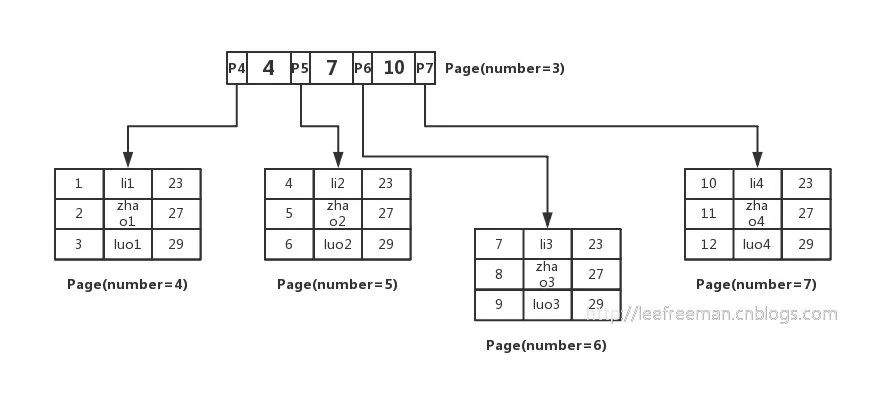 如果数据库只按这样的方式存储,那么如何查找数据就成为一个问题,因为我们不知道要查找的数据存在哪个页中,也不可能把所有的页遍历一遍,那样太慢了。所以人们想了一个办法,用B+树的方式组织这些数据。如图所示: