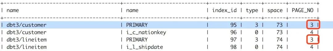 可以看出数据库dbt3下的customer表、lineitem表主键索引根页的page number均为3,而其他的二级索引page number为4。关于二级索引与主键索引的区别请参考MySQL相关书籍,本文不在此介绍。