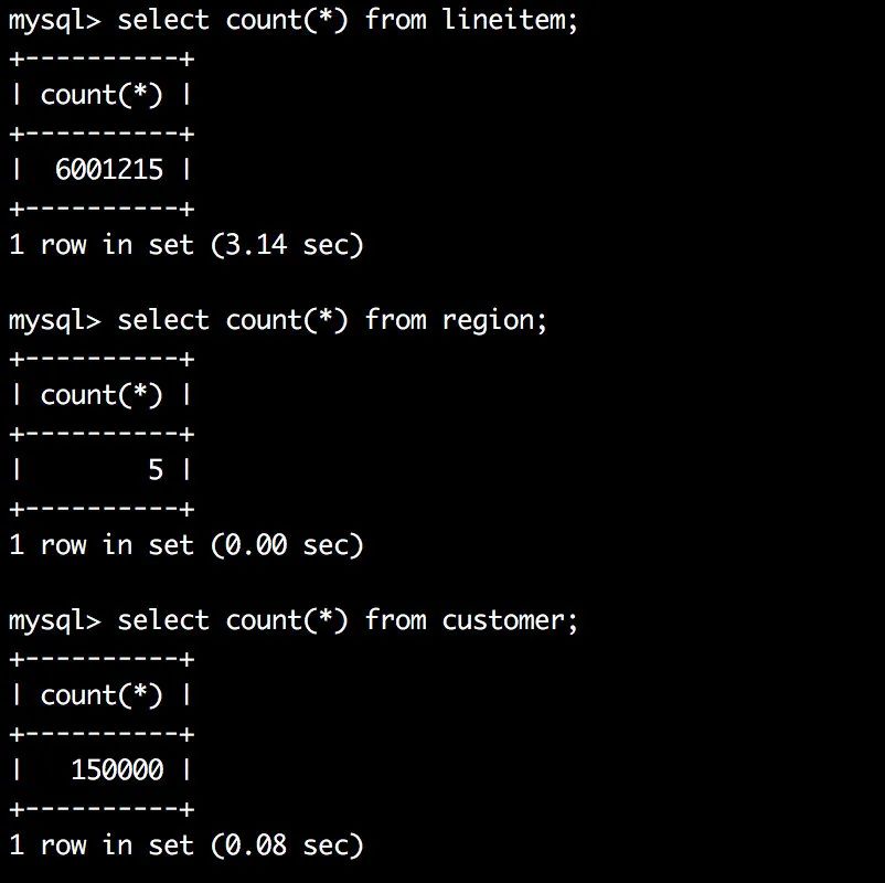 lineitem表的数据行数为600多万,B+树高度为3,customer表数据行数只有15万,B+树高度也为3。可以看出尽管数据量差异较大,这两个表树的高度都是3,换句话说这两个表通过索引查询效率并没有太大差异,因为都只需要做3次IO。那么如果有一张表行数是一千万,那么他的B+树高度依旧是3,查询效率仍然不会相差太大。