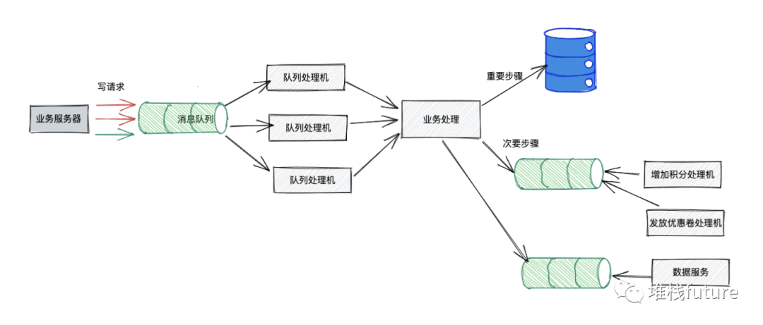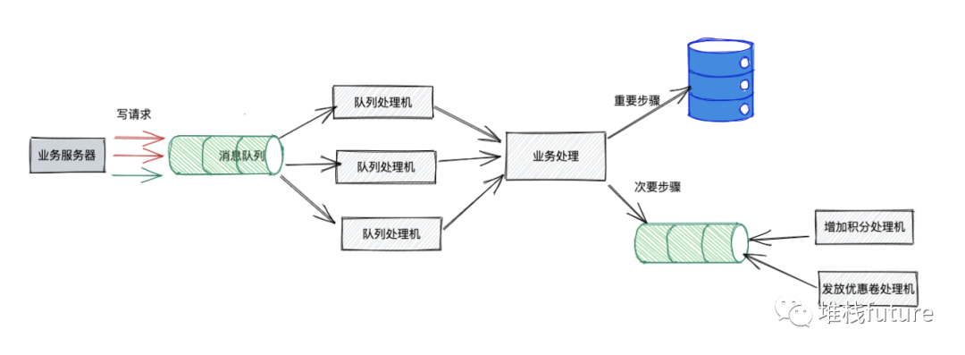 我们秒杀场景中有重要的业务逻辑(生成订单,扣减库存),也有次要的业务逻辑(发放优惠卷,增加积分)。如果把次要的业务逻辑放到队列中异步处理,那么重要的逻辑就会相应的减少延迟,一定程度上解决用户等待过长时间的问题。