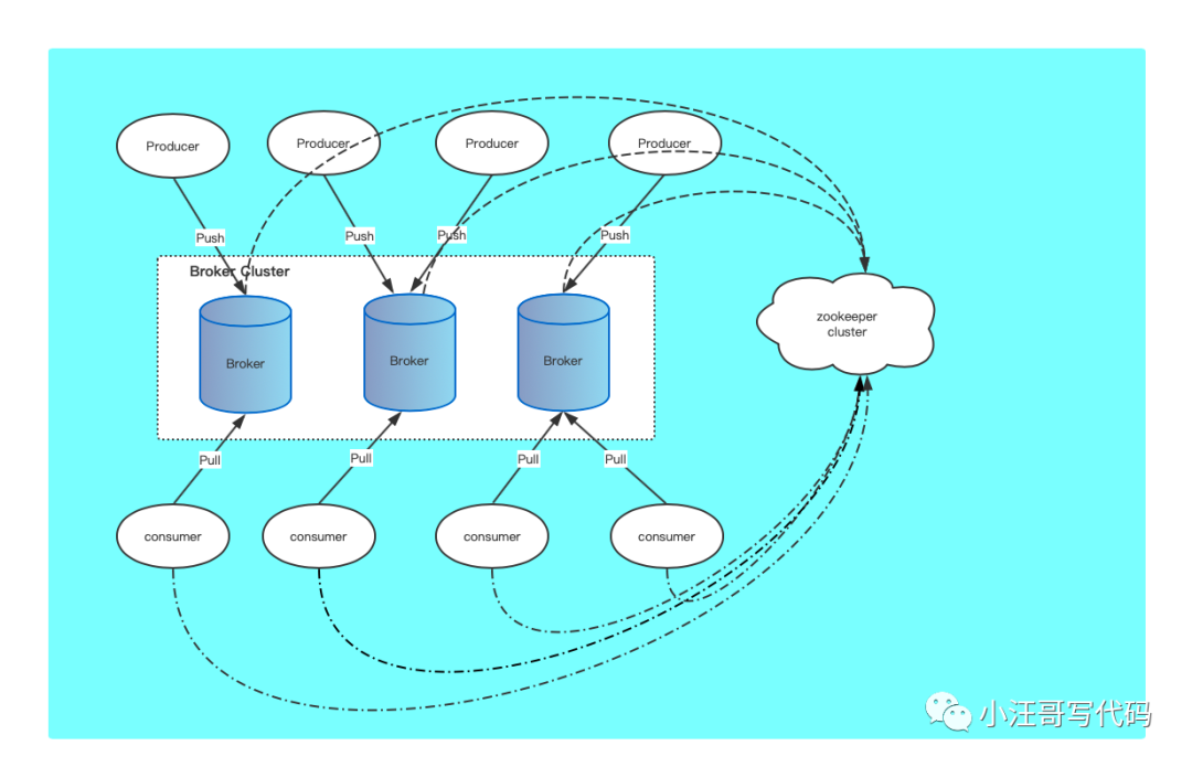 ZooKeeper 充当 Kafka 的领导者,以更新集群中的拓扑更改;根据 ZooKeeper 提供的通知,生产者和消费者发现整个 Kafka 集群中是否存在任何新 Broker 或 Broker 失败。大多数的运维操作,比如说扩容、分区迁移等等,都需要和 ZooKeeper 交互。