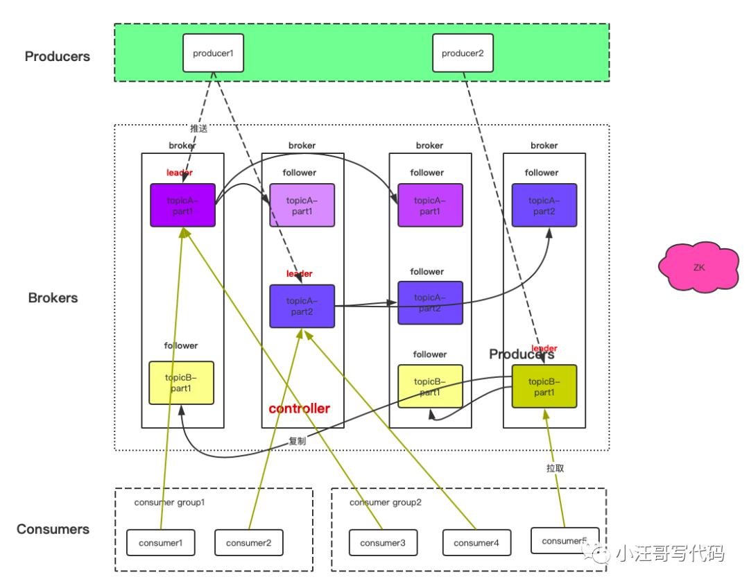 再次细分,broker有一个controller角色,每一个broker 可能存多个Topic的不同partion,每个partion 都有 leader 和follower 。这些信息都会注册到zk上。