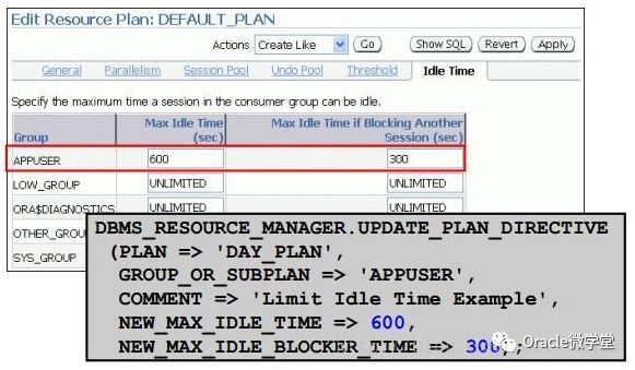 “Max Idle Time (sec)(最长空闲时间(秒))”和“Max Idle Time if Blocking Another Session (sec)(阻塞其他会话时的最大空闲时间(秒))”分别等效于DBMS_RESOURCE_MANAGER.UPDATE_PLAN_DIRECTIVE过程中的NEW_MAX_IDLE_TIME和NEW_ MAX_IDLE_BLOCKER_TIME资源指令。这两项均以秒为单位。
