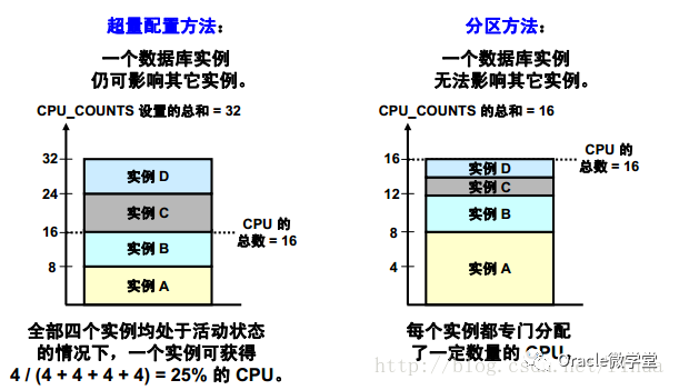 超量配置方法:此方法适用于非关键性数据库和低负载、非关键性的生产系统。虽然实例相互影响彼此的性能,但是在任意给定的时间,都会有一个或多个实例可能处于闲置状态或者负载较低。