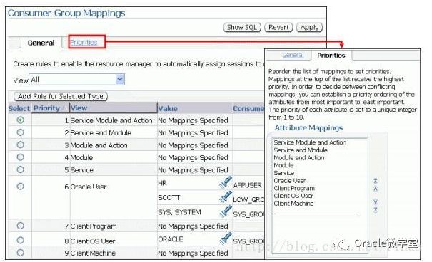 在Database Control 主页中,导航到“Server(服务器)”选项卡页,然后单击“Resource Manager(资源管理器)”部分中的“Resource Consumer Group Mappings(资源使用者组映射)”链接。对于每个属性,设置由标识会话的方法(如用户名)和使用者组所组成的映射。根据需要,添加或删除每个资源使用者组类别所对应的行,并在相应组中输入用于标识用户、客户机、模块或服务的文本。使用“Priorities(优先级)”选项卡,可以建立冲突的属性映射之间的优先级顺序。使用导航箭头(幻灯片中突出显示)可以按重要性从