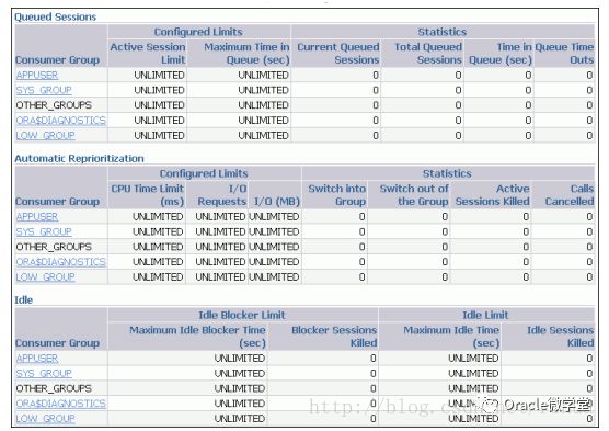 • V$RSRC_CONSUMER_GROUP:queue_length列显示每个使用者组中当前排队的会话数。