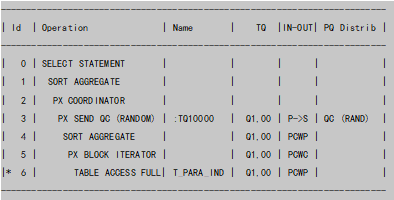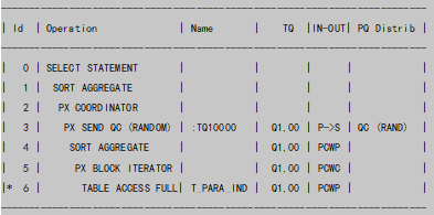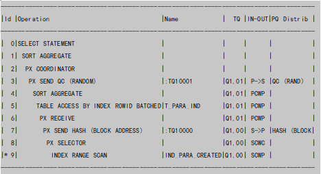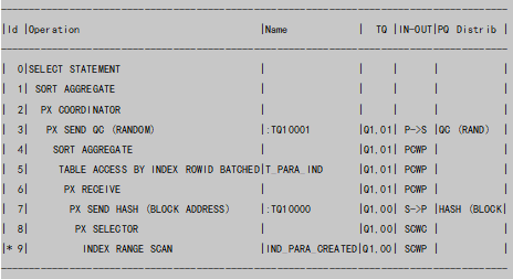 如果仔细观察IN-OUT列,就会发现Oracle的并行执行实际上从第6步才开始,第7步是串行到并行的过程,而第7步之前的第9步和第8步都是串行执行。
