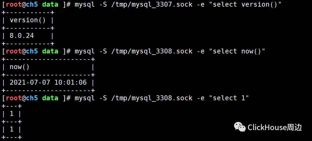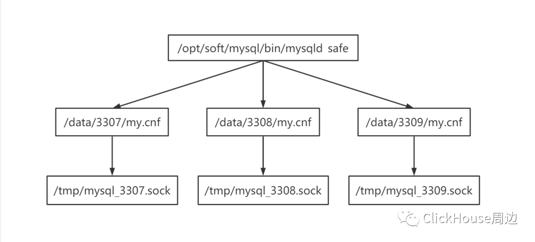 mysqld_safe --defaults-file=/data/3307/my.cnf &mysqld_safe --defaults-file=/data/3308/my.cnf &mysqld_safe --defaults-file=/data/3309/my.cnf &netstat -lnutp|grep mysqldtcp6 0 0 :::33060 :::* LISTEN 11776/mysqldtcp6 0 0 :::3307 :::* LISTEN 11776/mysqldtcp6 0 0 :::3308 :::* LISTEN 11962/mysqldtcp6 0 0 :::3309 :::* LISTEN 12199/mysqldmysql -S tmp/mysql_3307.sockmysql -S /tmp/mysql_3308.sockmysql -S tmp/mysql_3309.sock