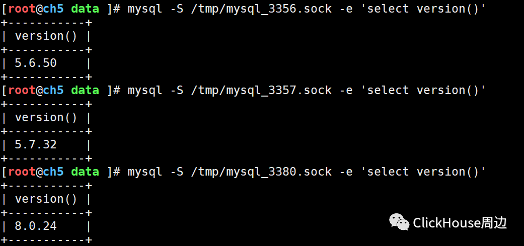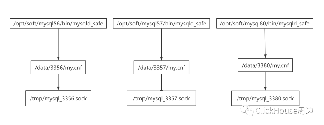 /opt/soft/mysql56/bin/mysqld_safe --defaults-file=/data/3356/my.cnf &/opt/soft/mysql57/bin/mysqld_safe --defaults-file=/data/3357/my.cnf &/opt/soft/mysql80/bin/mysqld_safe --defaults-file=/data/3380/my.cnf &netstat -lnutp|grep mysqldtcp6 0 0 :::33060 :::* LISTEN 11776/mysqldtcp6 0 0 :::3307 :::* LISTEN 11776/mysqldtcp6 0 0 :::3308 :::* LISTEN 11962/mysqldtcp6 0 0 :::3309 :::* LISTEN 12199/mysqldtcp6 0 0 :::3380 :::* LISTEN 17451/mysqldtcp6 0 0 :::3356 :::* LISTEN 17888/mysqldtcp6 0 0 :::3357 :::* LISTEN 17692/mysqldmysql -S tmp/mysql_3356.sockmysql -S /tmp/mysql_3357.sockmysql -S tmp/mysql_3380.sock