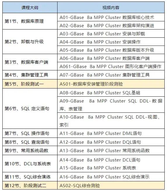本课程从8a集群产品零基础开始,讲解8a集群数据库的原理与基本使用。整个课程分为学习和考试2个阶段、10节课程,2次单元测验,2次认证考试机会,整个学习有专职老师在微信群中及时答疑解惑。