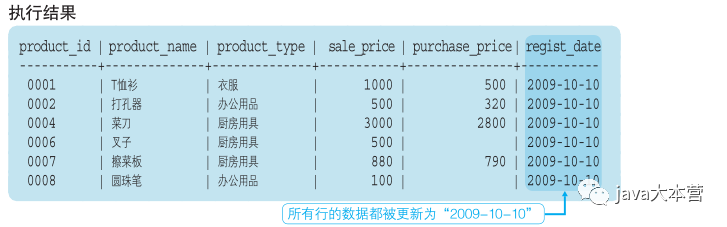 代码清单4-15 将登记日期全部更新为“2009-10-10”UPDATE ProductSET regist_date = '2009-10-10';