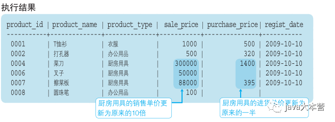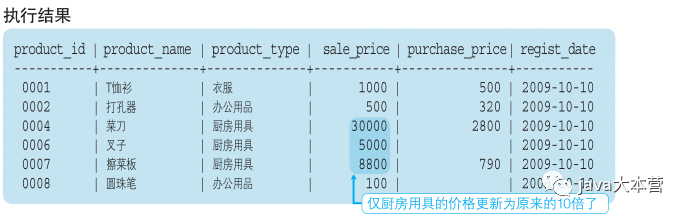 该语句通过 WHERE 子句中的“ product _ type = ' 厨房用具 ' ”条件,将更新对象限定为 3 行。然后通过 SET 子句中的表达式 sale _price * 10 ,将原来的单价扩大了 10 倍。SET 子句中赋值表达式的右边不仅可以是单纯的值,还可以是包含列的表达式。