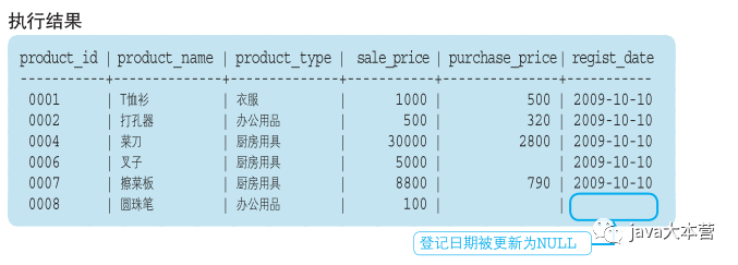 使用 UPDATE 也可以将列更新为 NULL (该更新俗称为 NULL 清空)。此时只需要将赋值表达式右边的值直接写为 NULL 即可。例如,我们可以将商品编号( product _ id )为 0008 的数据(圆珠笔)的登记日期( regist _ date )更新为 NULL (代码清单 4-17)。