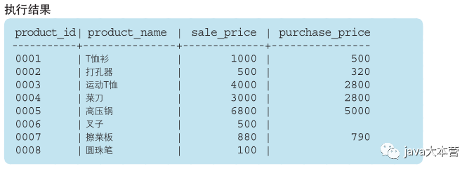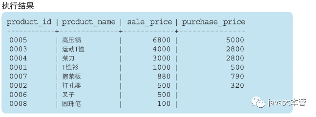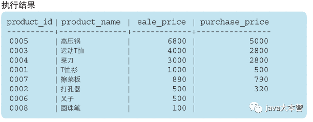 代码清单3-33 SELECT 子句中未包含的列也可以在 ORDER BY 子句中使用SELECT product_name, sale_price, purchase_priceFROM ProductORDER BY product_id;