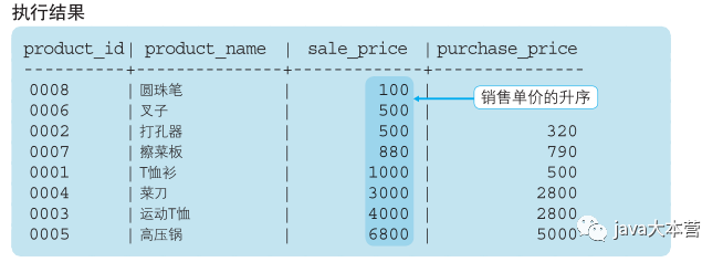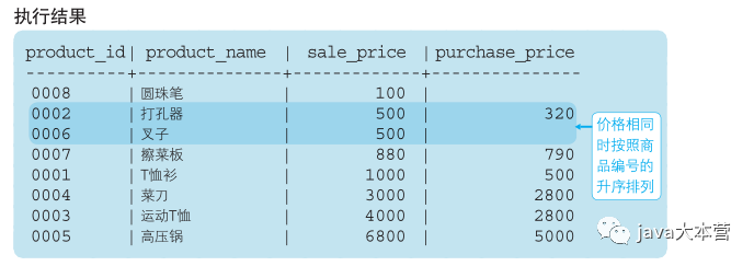 代码清单3-30 按照销售单价和商品编号的升序进行排序SELECT product_id, product_name, sale_price, purchase_priceFROM ProductORDER BY sale_price, product_id;