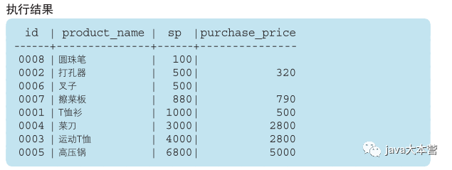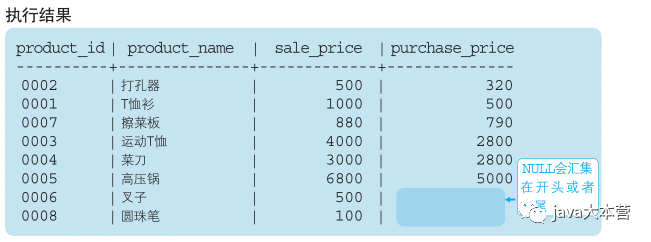 在此前的示例中,我们已经使用过销售单价( sale _ price 列)作为排序键了,这次让我们尝试使用进货单价( purchase _ price 列)作为排序键吧。此时,问题来了,圆珠笔和叉子对应的值是 NULL ,究竟NULL 会按照什么顺序进行排列呢?NULL 是大于100还是小于100呢?或者说 5000 和 NULL 哪个更大呢?