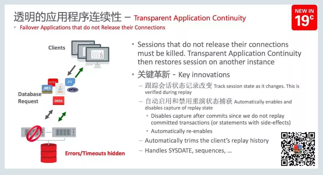 在Oracle RAC集群中,支持对于查询的自动切换,当一个节点失效,转移到另外一个节点,在19c中,Oracle 持续改进和增强了连续性保持,数据库会自动记录会话状态,捕获用于重演的信息,以便在切换时,在新节点自动恢复事务,使DML事务同样可以获得连续性支持: