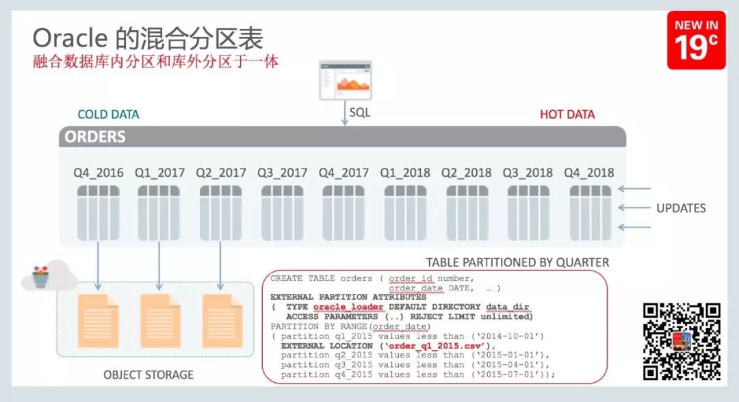 在 19c 中,Oracle 增强了分区特性,可以将外部对象存储上的文件,以外部表的方式链接到分区中,形成混合分区表,借助这个特性,Oracle 将数据库内外整合打通,冷数据可以剥离到外部存储,热数据在数据库中在线存储。