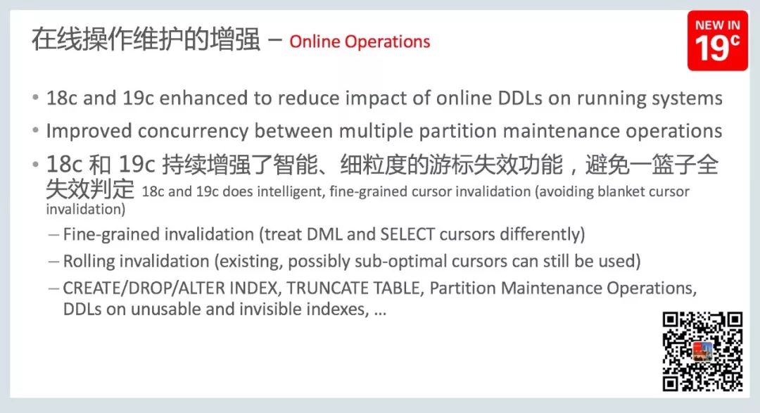 在19c 中,持续增强了智能的、细粒度的游标失效控制,将DDL操作对于游标失效的影响降至最低,例如,在 19c 中,comment on table的操作,将不会引起游标的失效。