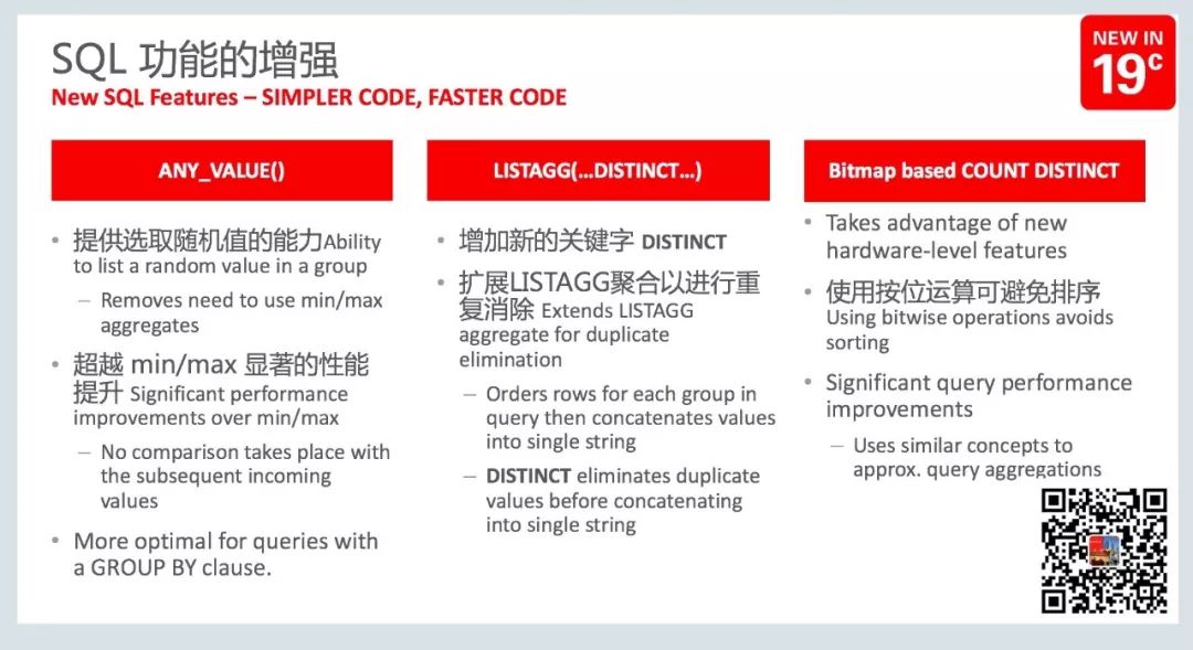 在 19c 中,SQL 功能获得了进一步的增强,这其中包括对于 COUNT DISTINCT的进一步优化,在12c中引入的近似 Distinct 操作已经可以为特定SQL带来极大性能提升,现在基于位图的COUNT DISTINCT 操作继续为查询加速。