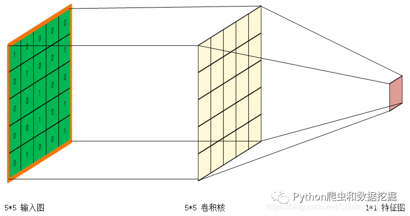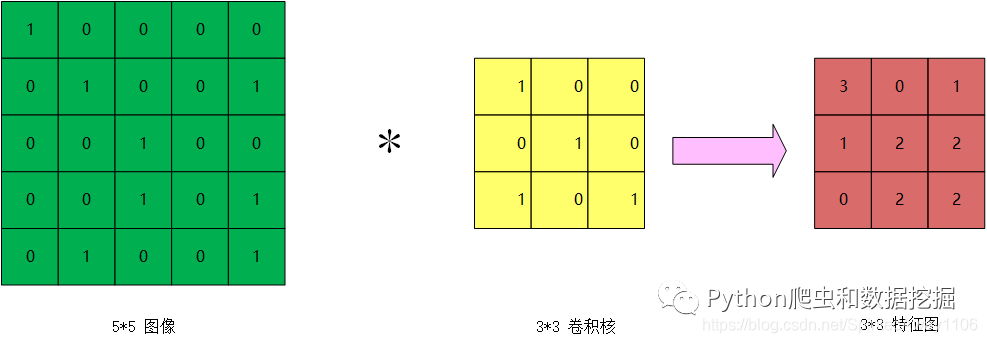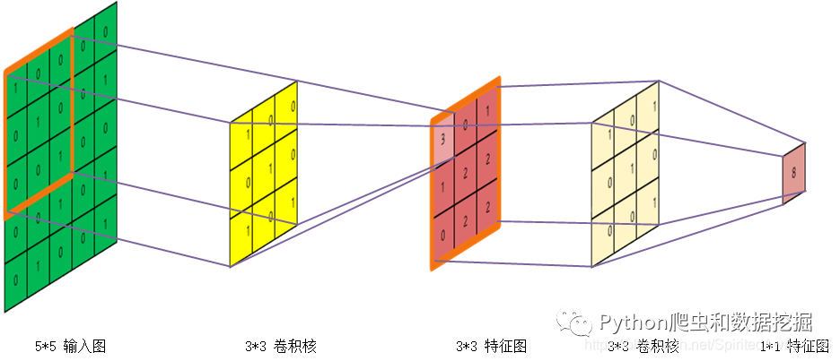 为了方便描述以及绘图,我们以输入图为,卷积核为,步长为的卷积运算为例,将得到一个的特征图。