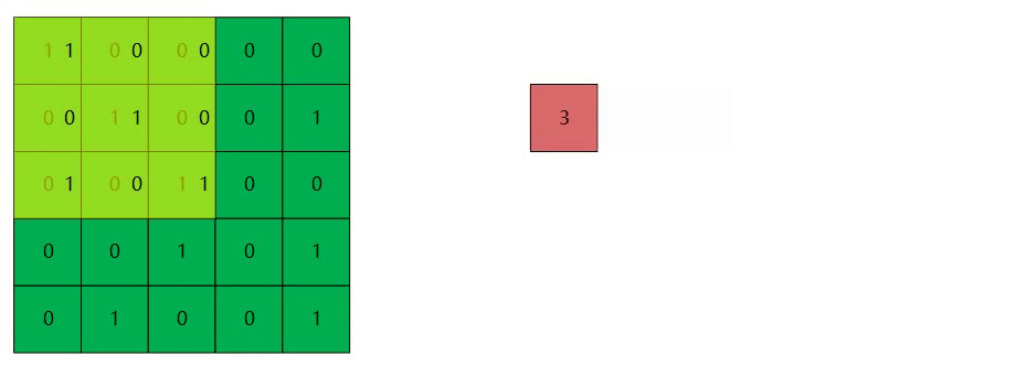 然后将卷积核从输入图中向右移动一步,在进行相乘和相加操作,得到特征图的第二个值:, 依次进行该操作,就可以得出特征图的所有值了,下面的动图很清晰的描述了卷积计算过程。