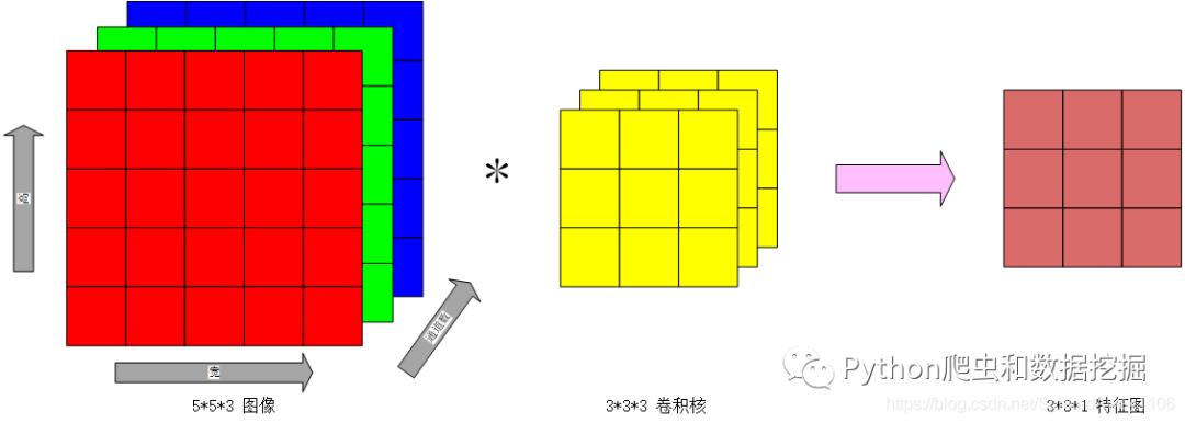我们现在已经知道了如何对二维的灰度图像进行卷积,现在我们看下如何对具有三通道的彩色图像进行卷积。如下图,对一个的图像进行卷积,为了保证每个通道都能被正确计算,我们必须使用与输入图像通道数一致的卷积核,这里我们使用了一个的卷积核,将得到了一个 的特征图